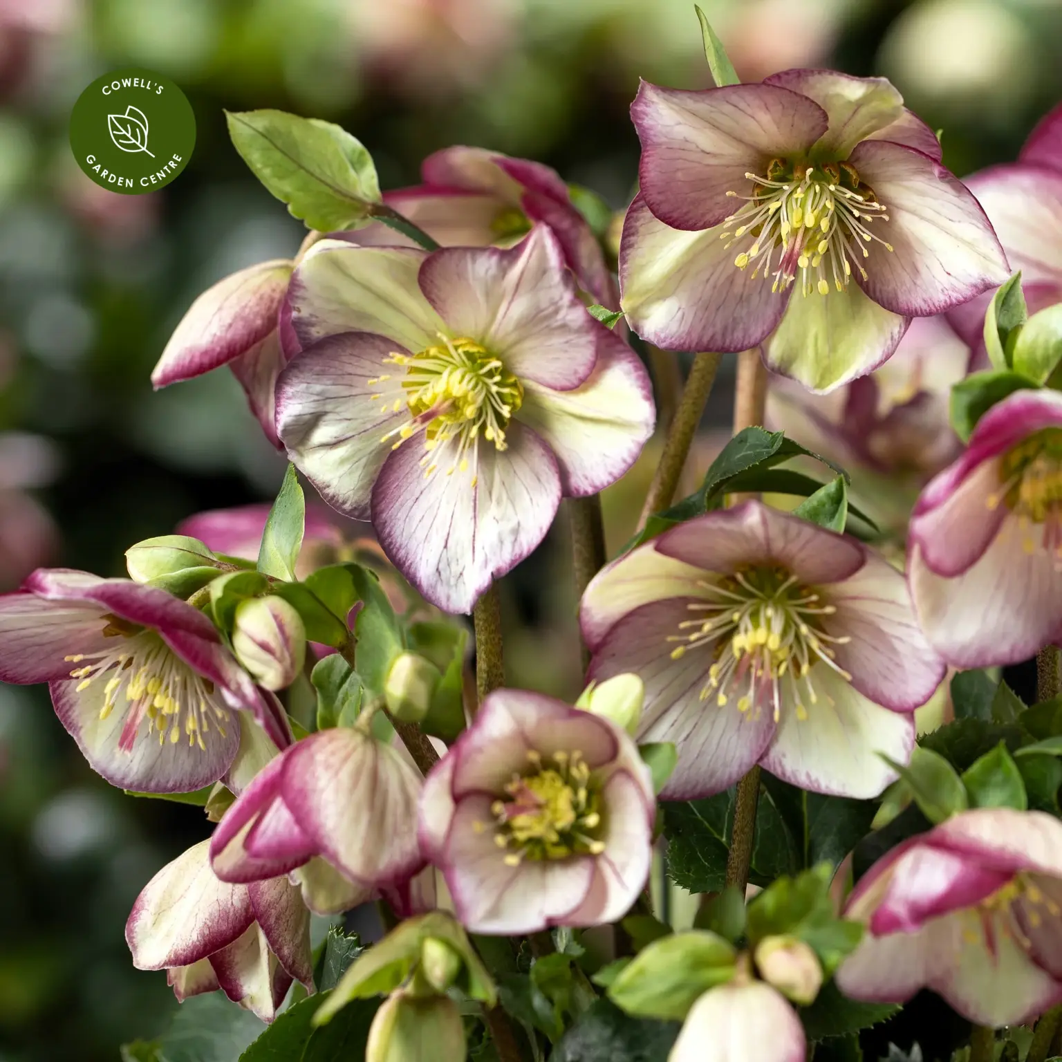 Helleborus 'HGC® Ice Breaker Bonny' is a hardy evergreen perennial prized for its long and reliable flowering season. From December through March, it produces a mass of single white flowers delicately edged in pink, each bloom standing out against a backdrop of glossy dark foliage. The flowers emerge in abundance, providing brightness and cheer to the garden when little else is in bloom.