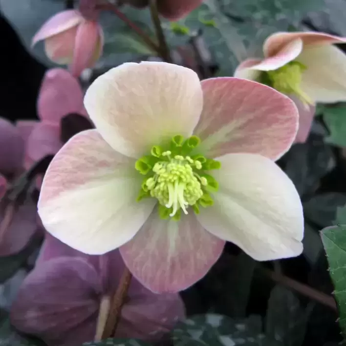 Helleborus 'HGC® Merlin' is a compact, evergreen perennial with exceptional winter and early spring interest. From late January onwards, it produces an abundance of outward-facing blooms that open in soft peach-pink tones and gradually deepen to rich shades of plum and burgundy as they age, creating a long-lasting, vintage-style display. The leathery, dark green foliage remains year-round, adding structure and texture to borders and containers.