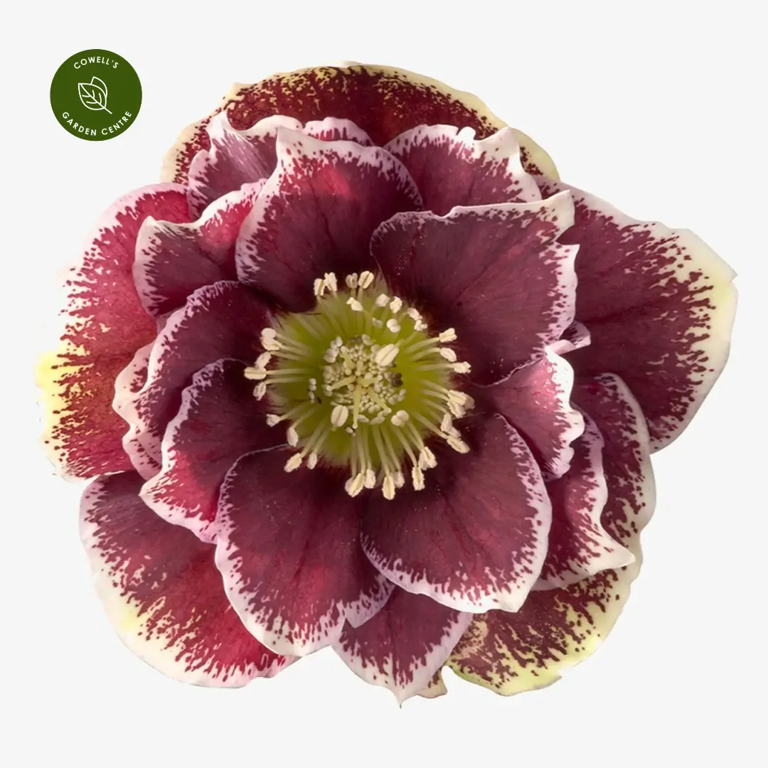 Helleborus 'Rubina' is a bold and beautiful evergreen perennial that adds rich winter colour to the garden. From late winter to early spring, it produces large, ruffled, outward-facing double flowers in deep purple-pink to ruby-red tones, each bloom accented with creamy-white edging and a subtle sheen. The long-lasting flowers contrast elegantly with the dark green, leathery foliage, providing colour when few other plants are in bloom.