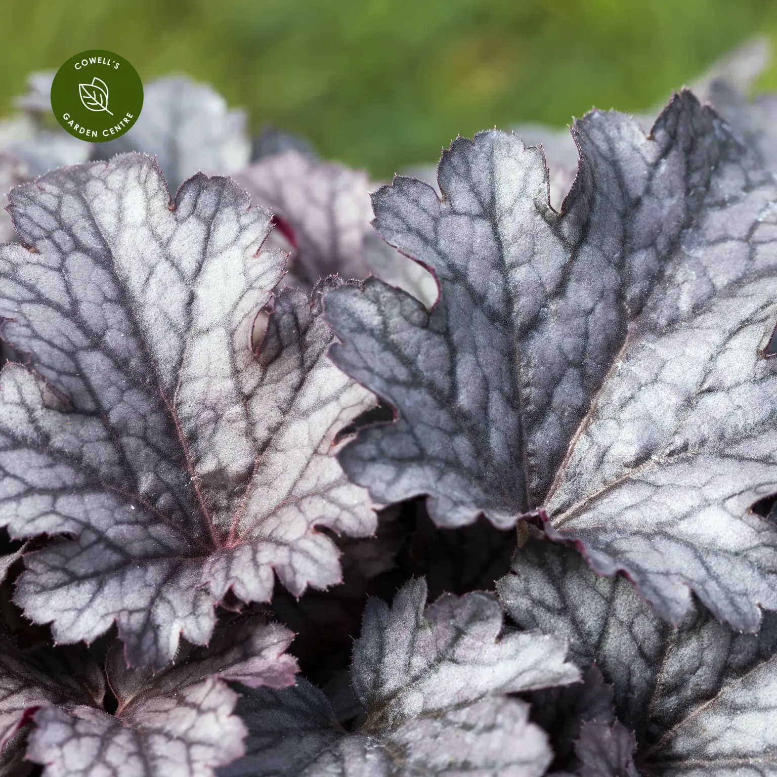 Heuchera 'Plum Pudding' is a striking foliage perennial, valued for its rich purple leaves overlaid with a subtle silver sheen, bringing depth and colour to the garden throughout the year.
