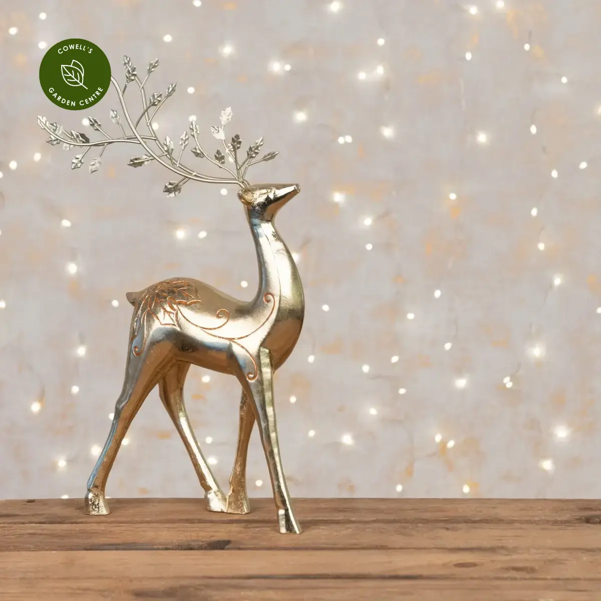 Wonderful metal deer figurine, with intricate holly leaf antlers and etched detailing on the body, to add the finishing touch to your festive decorations.