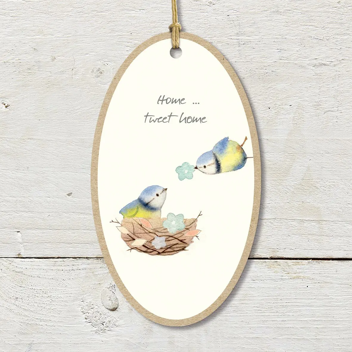 Large Wooden Plaque featuring two cute nesting blue tits with a ’Home… tweet home’ caption. Perfect as a gift.