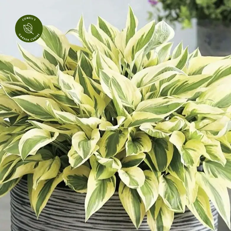 Hosta 'Bobcat' is a striking, variegated Hosta with elongated, pointed leaves featuring soft green centres and creamy-yellow margins that brighten shady areas. Its dense, flowing habit creates a full, cascading mound of foliage, perfect for adding contrast and light to darker parts of the garden.