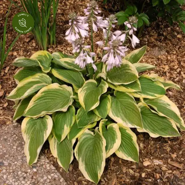 Hosta 'Frozen Margarita' is a striking, medium-sized perennial with attractive heart-shaped leaves featuring rich green centres surrounded by broad, creamy-yellow margins. The bold variegation brings brightness and contrast to shaded areas of the garden.