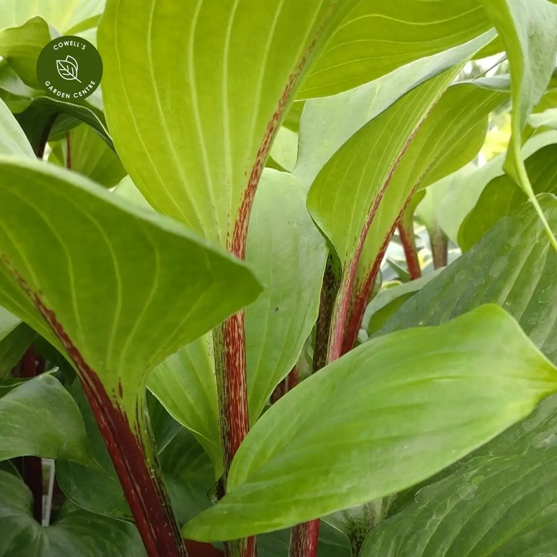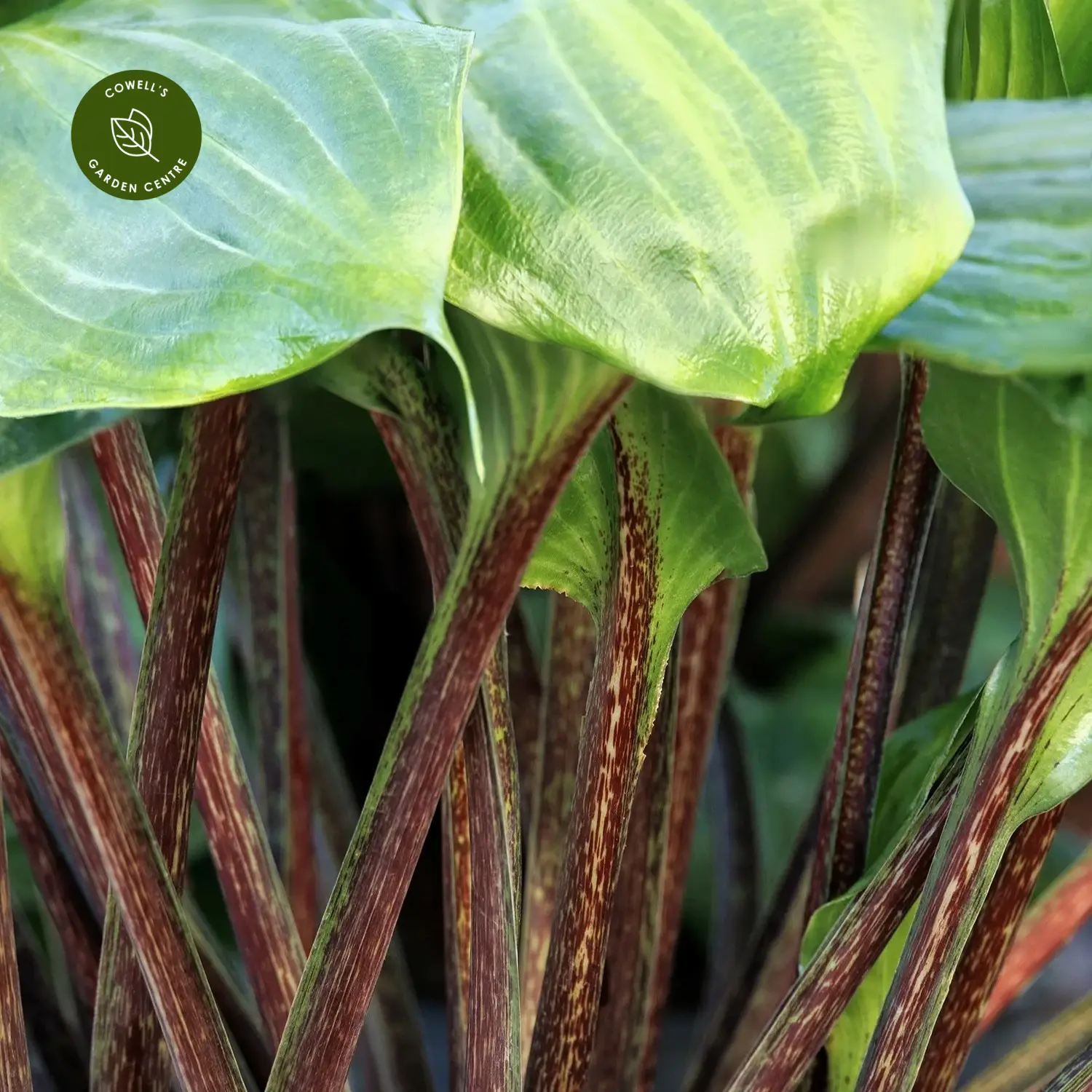 - Glossy green leaves with striking plum-coloured stems