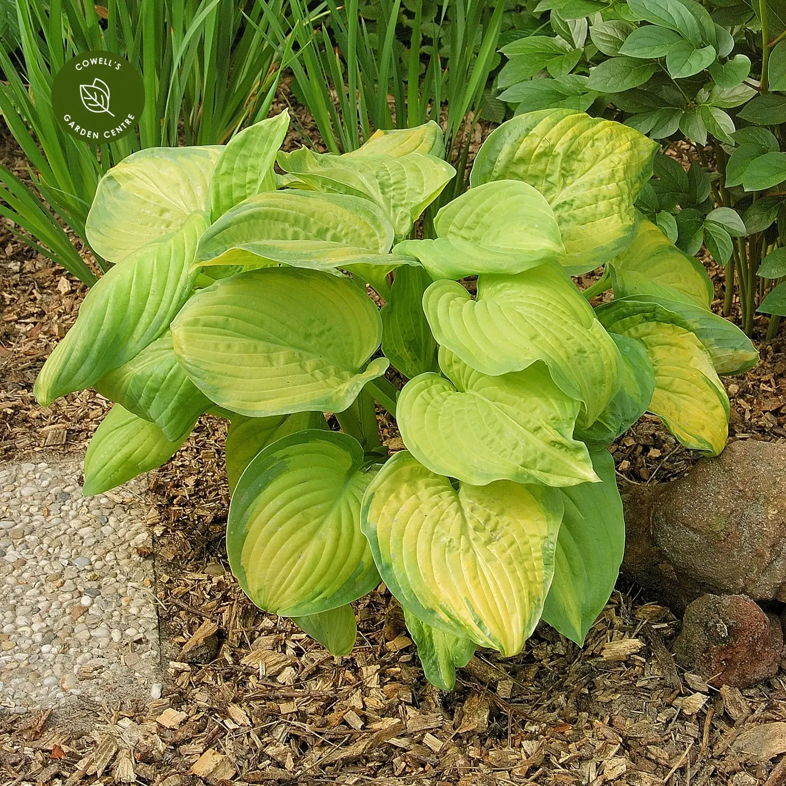 Hosta 'Stained Glass' is a striking perennial featuring large, heart-shaped leaves with glowing golden-yellow centres framed by deep green margins. The vibrant foliage brings brightness and contrast to shaded areas of the garden.