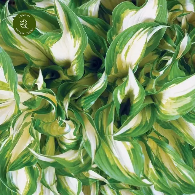 - Green leaves with creamy-white centres and wavy edges