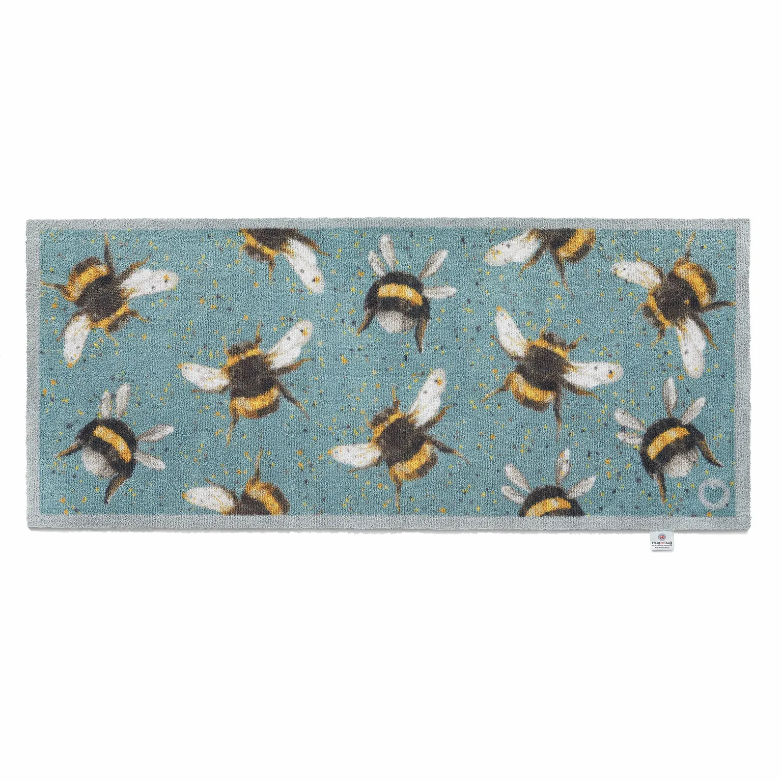 Support the Bumblebee Conservation Trust with the Bee design, featuring a blue background with charcoal and yellow splatter dots, and features hand drawn multidirectional bees, with a light grey border.