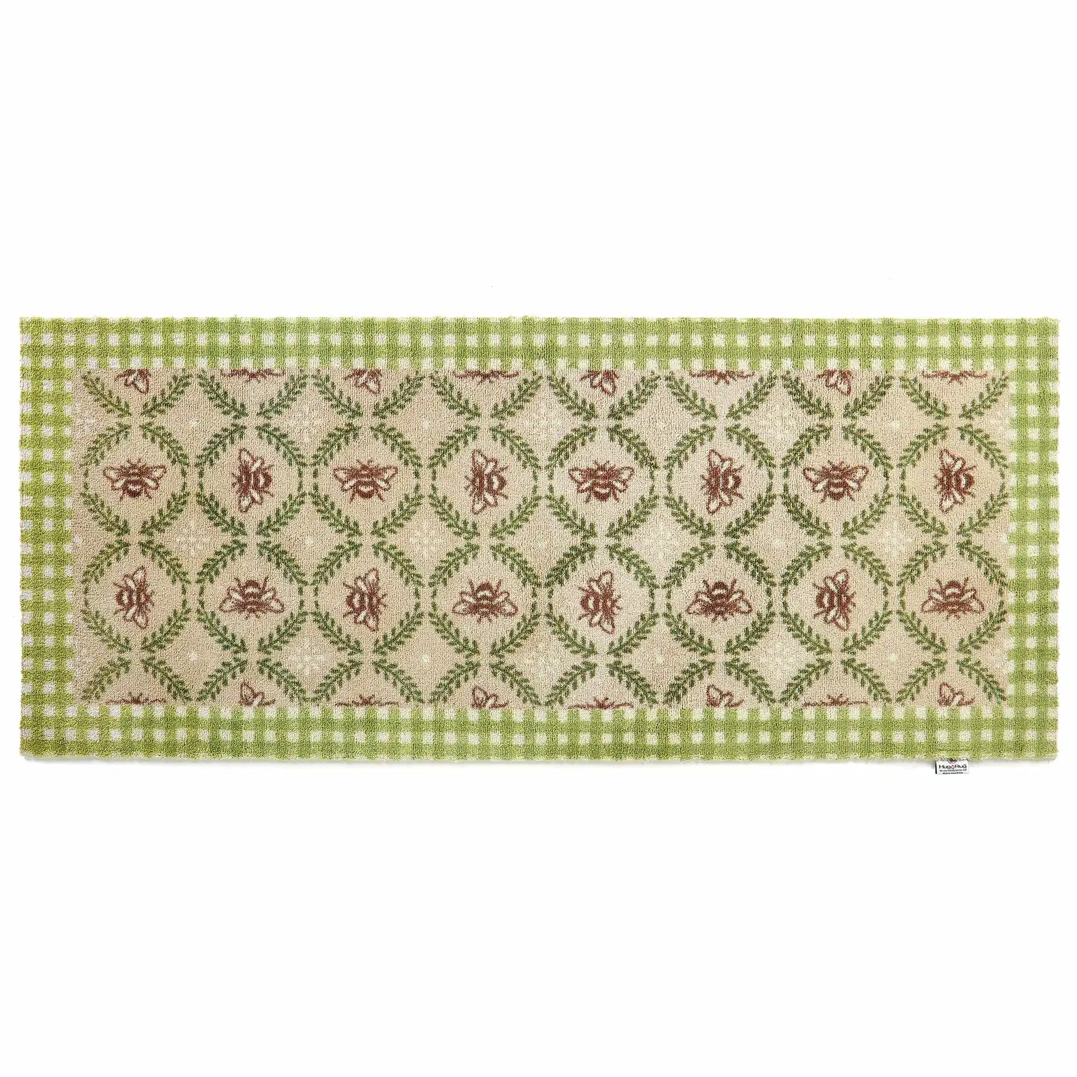 Set against a beige backdrop, this design features a white and green checked border and a collection of hand-painted bumblebees surrounded by a leafy garland. Purchasing this mat will support the Bumblebee Conservation Trust. Designed with a low pile height to glide effortlessly under doors while providing a luxurious cushioned feel.