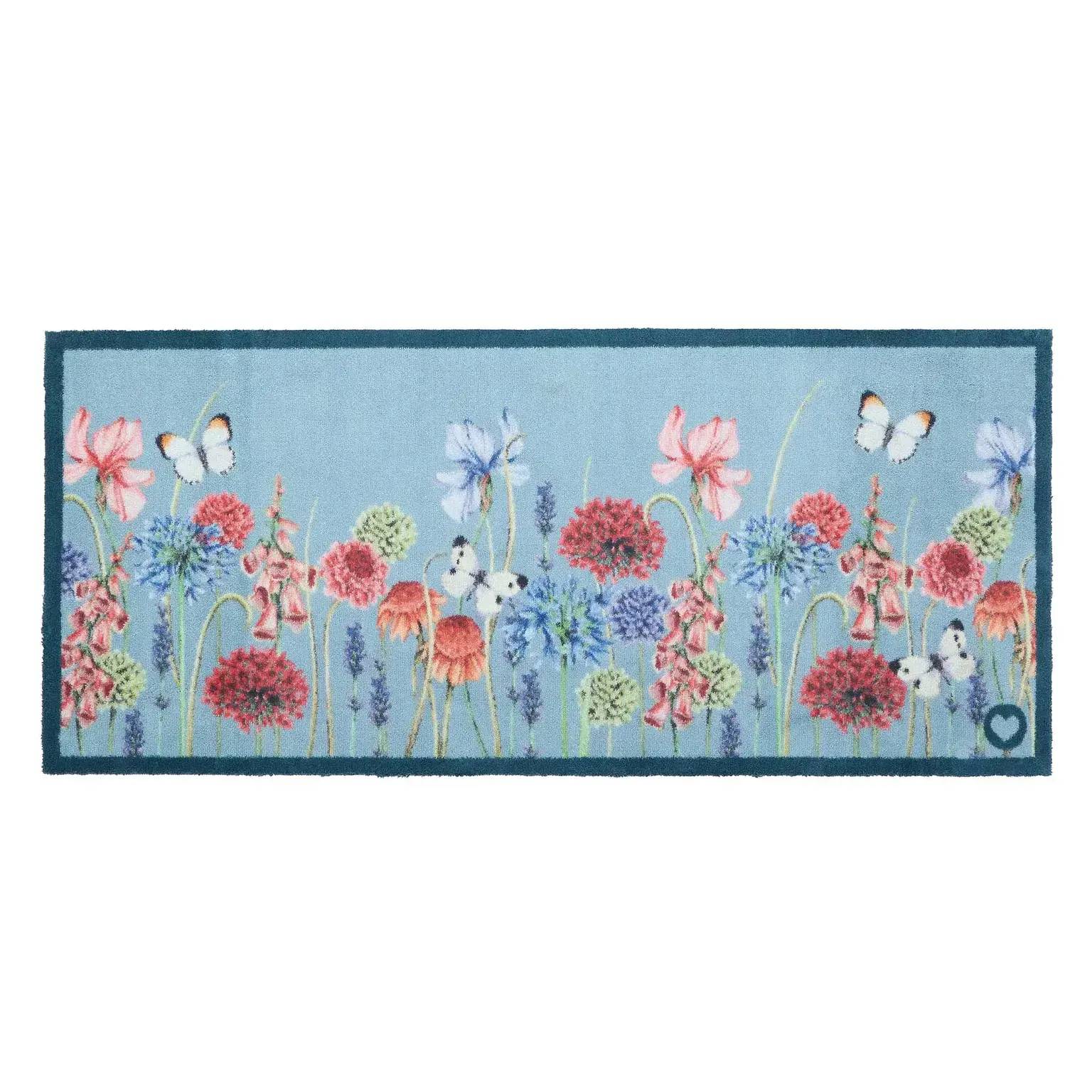 Add a fresh, nature-inspired feel to your home with the Butterfly Garden Blue runner. Set on a soft light blue background, this design showcases a vibrant wildflower garden brought to life with delicate white butterflies.