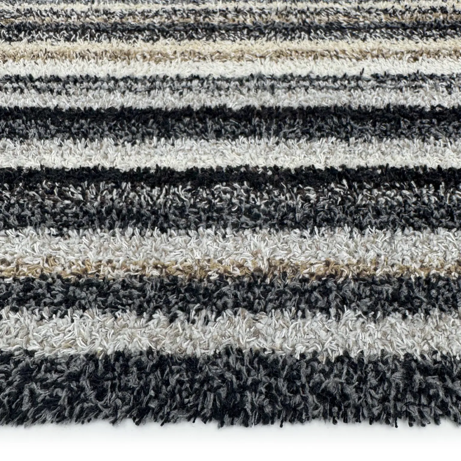 Candy Stripe monochrome features a captivating striped pattern of calming greys and creams. Designed with a low pile height to glide effortlessly under doors while providing a luxurious cushioned feel.