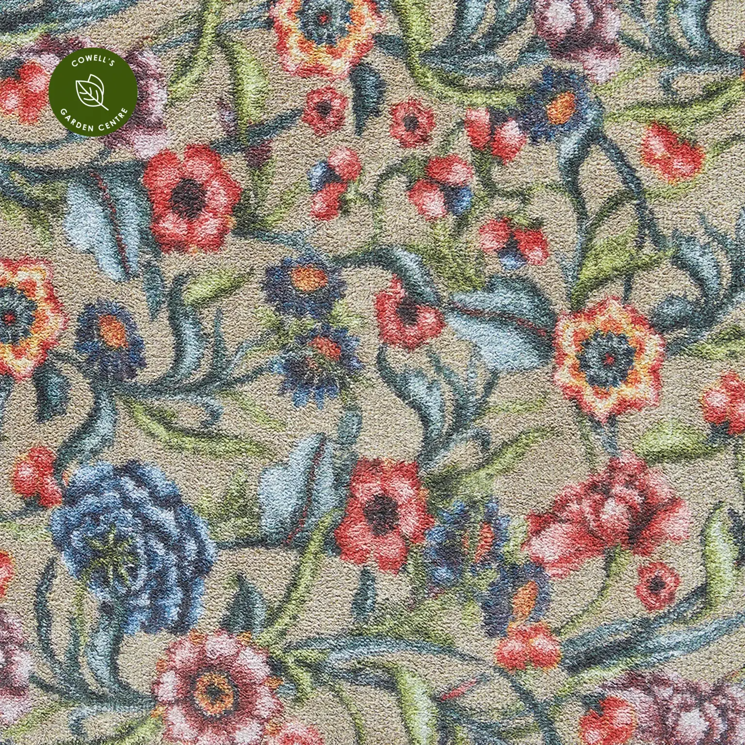 Garden Multi Floral is part of the Home and Garden collection. The design incorporates a mix of blue and red flowers, intertwined with green leaves on a beige background with a charcoal border.