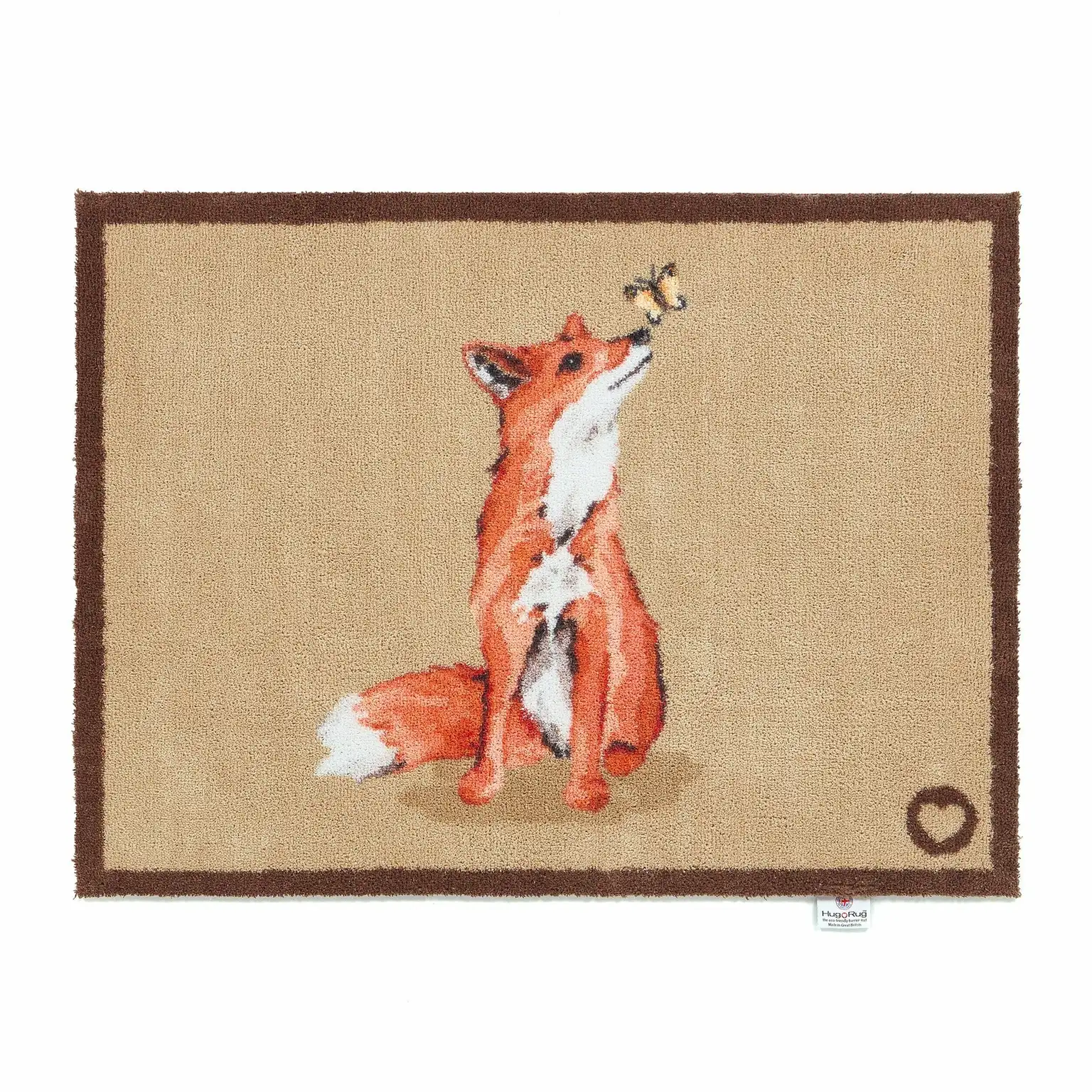 Set against a beige backdrop, this design features a hand-painted ginger fox gazing at a yellow butterfly. Designed with a low pile height to glide effortlessly under doors while providing a luxurious cushioned feel.
