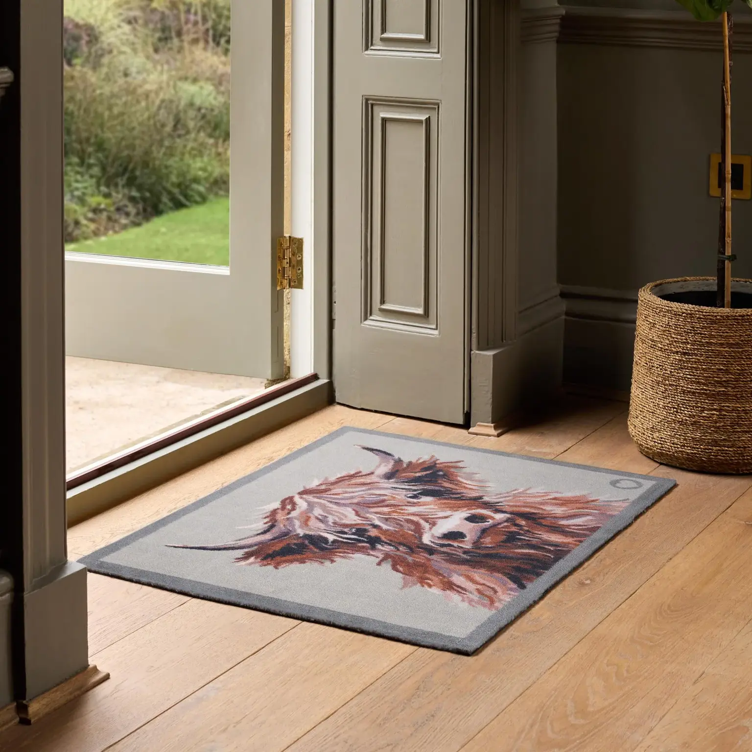 Add a touch of British countryside charm to your home with the Heritage Highland Cow washable doormat, featuring a white and brown cow on light grey. Designed with a low pile height to glide effortlessly under doors while providing a luxurious cushioned feel.