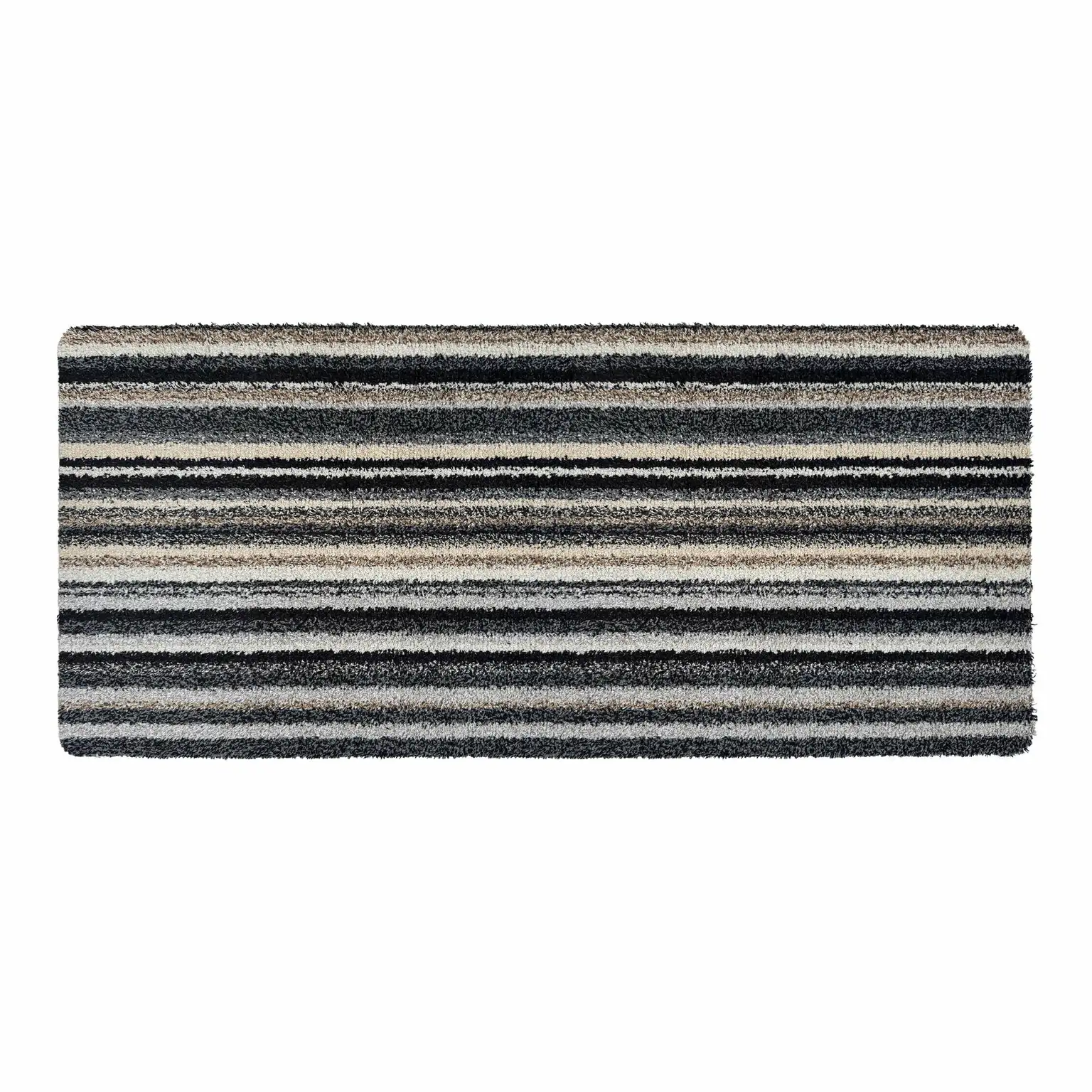 Candy Stripe monochrome features a captivating striped pattern of calming greys and creams. Designed with a low pile height to glide effortlessly under doors while providing a luxurious cushioned feel.
