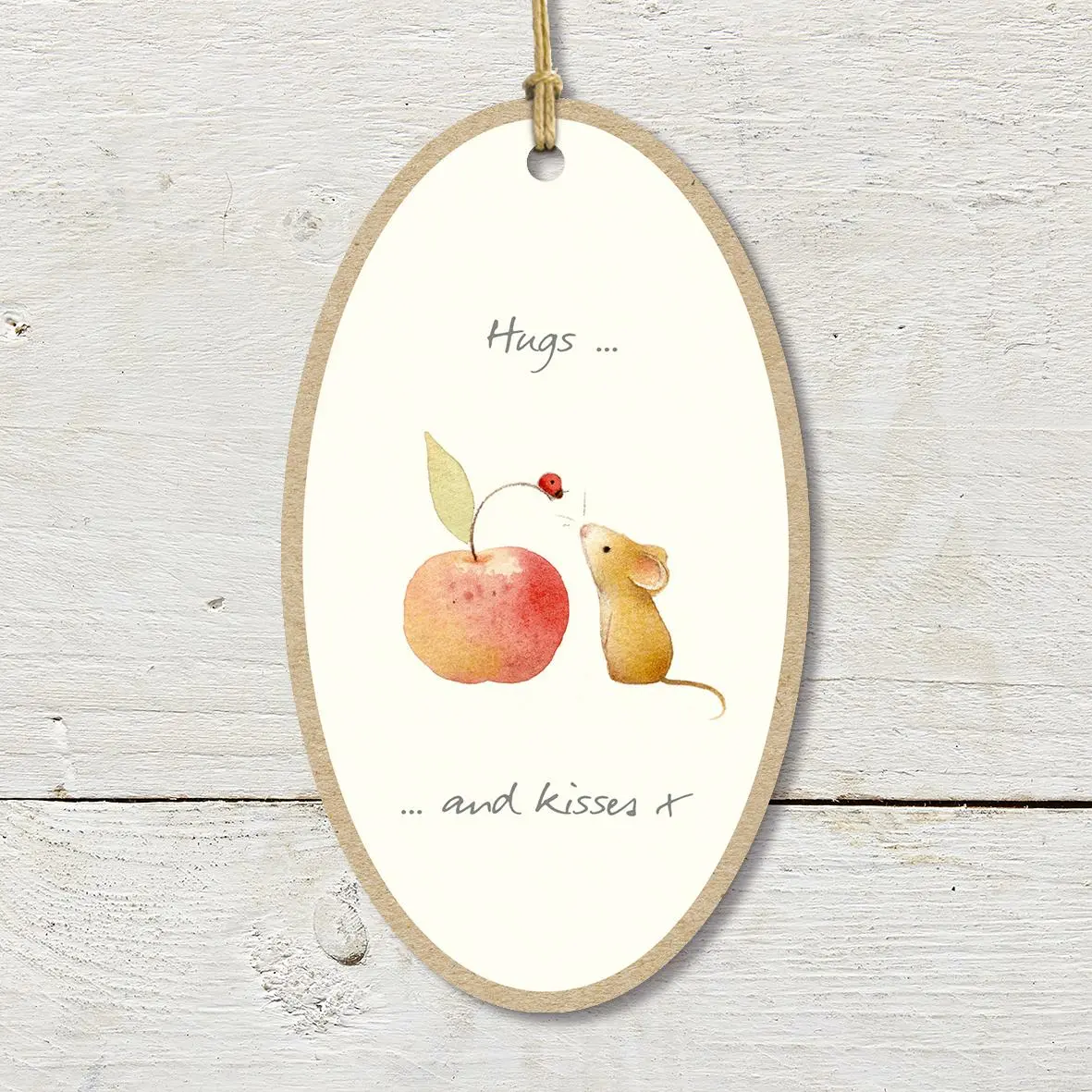 Large Wooden Plaque featuring a cute mouse and red apple with a ’Hugs… and kisses X’ caption. Perfect as a gift.