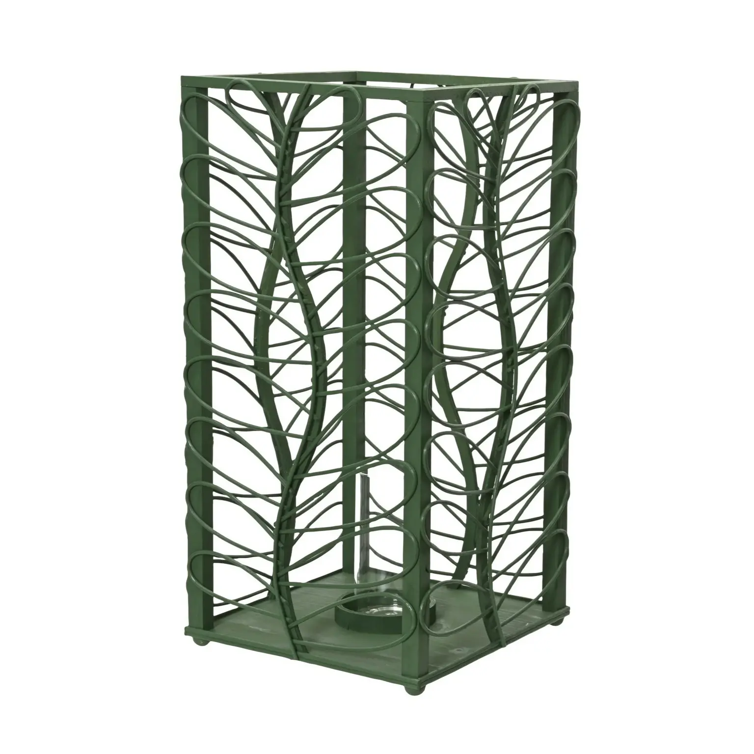 A stylish green hurricane candle holder, crafted from firwood with decorative rattan-style detailing, each featuring an internal glass holder for safe candle display.