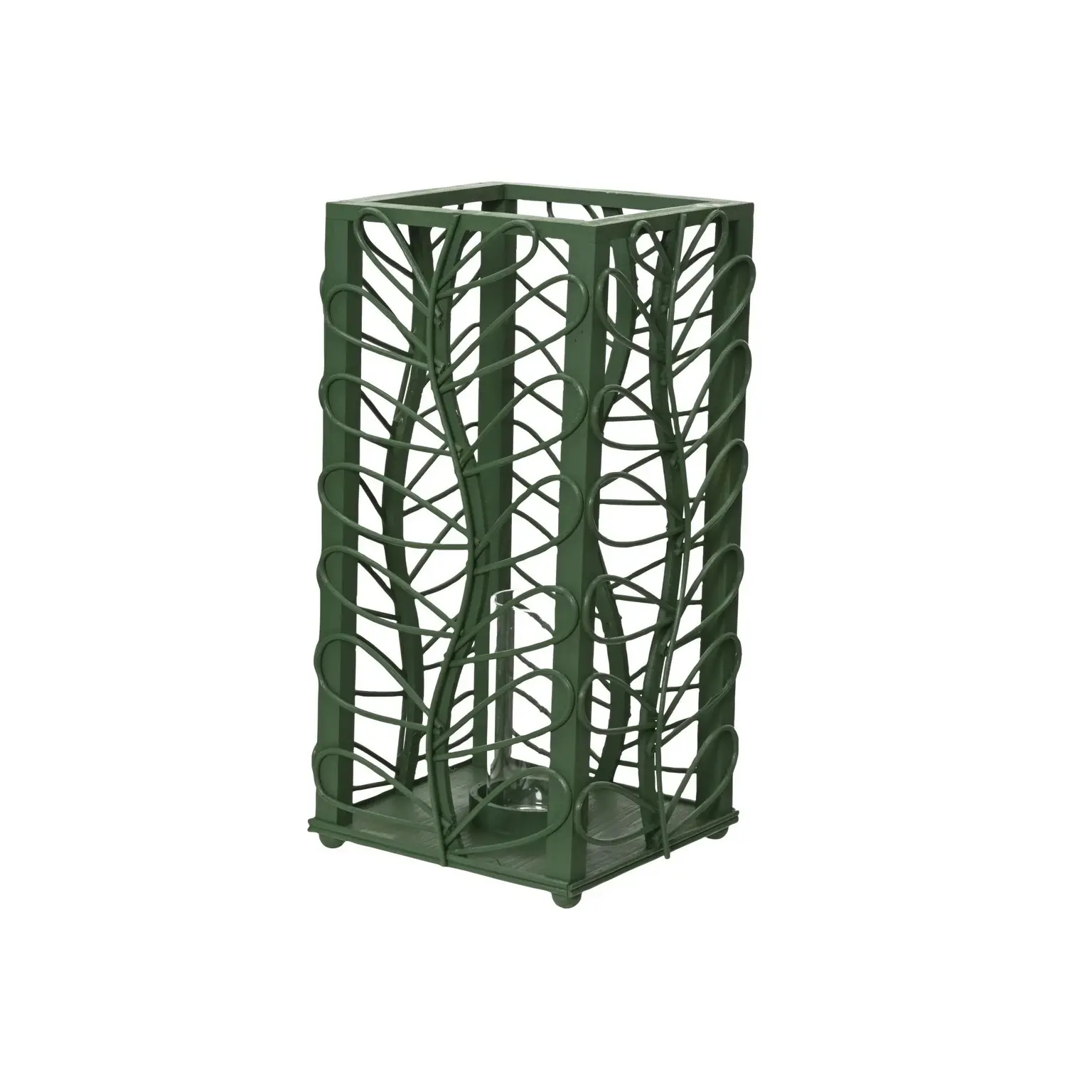 A stylish green hurricane candle holder, crafted from firwood with decorative rattan-style detailing, each featuring an internal glass holder for safe candle display.