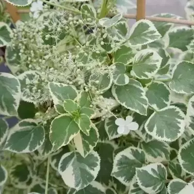 Hydrangea anomala subsp. petiolaris 'Silver Lining' is a vigorous and highly decorative climbing hydrangea, prized for its striking variegated foliage and strong wall-covering ability. The grey-green leaves are attractively edged and marbled with creamy white, bringing light and interest even to shaded areas of the garden.
