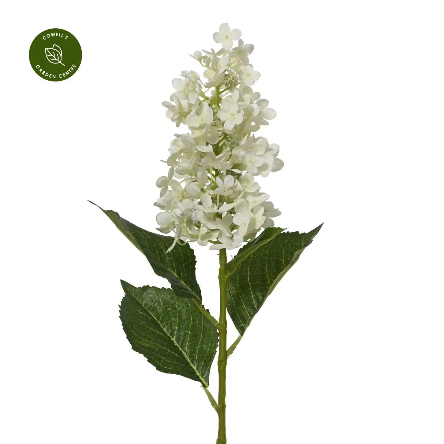 Realistic artificial Hydrangea stem with full flower head and detailed foliage, available in various colours to suit any interior style.