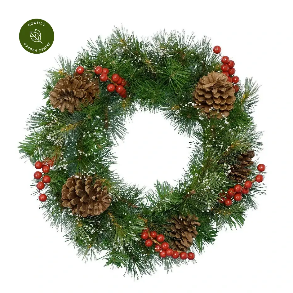 50cm diameter wreath decorated with berries and pinecones with a frosted finish.
