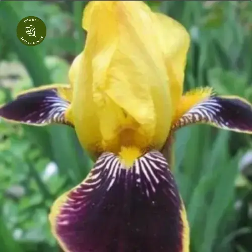 - Golden yellow standards with deep purple falls edged in yellow