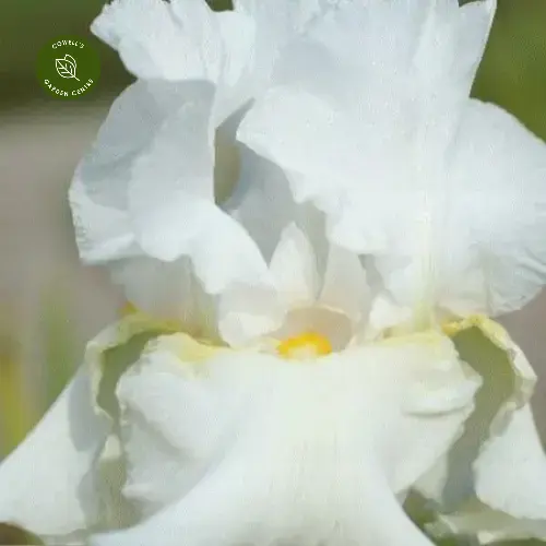 Iris germanica 'Glowing Seraphin' is an elegant tall bearded iris producing large, luminous white blooms with soft buttery-yellow tones near the throat and a golden beard. The gently ruffled petals create a refined, glowing effect in the border, standing out beautifully against the upright fans of sword-like grey-green foliage.