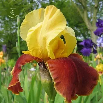 - Golden-yellow standards with deep chestnut-red falls