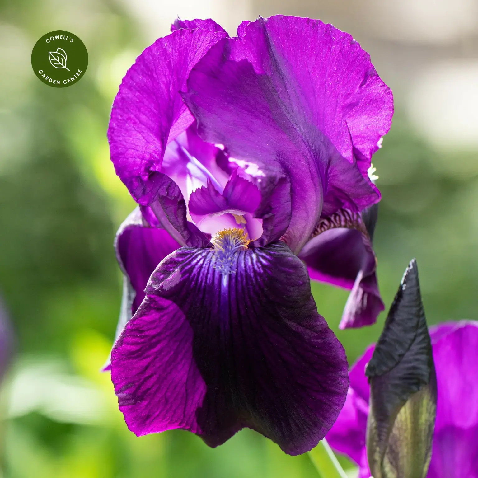 Iris 'Sable' is a striking bearded iris with wonderfully deep purple flowers, the standards appearing almost black for dramatic impact. The rich, velvety falls are complemented by vivid orange beards with a subtle blue tint, creating a bold and sophisticated contrast.