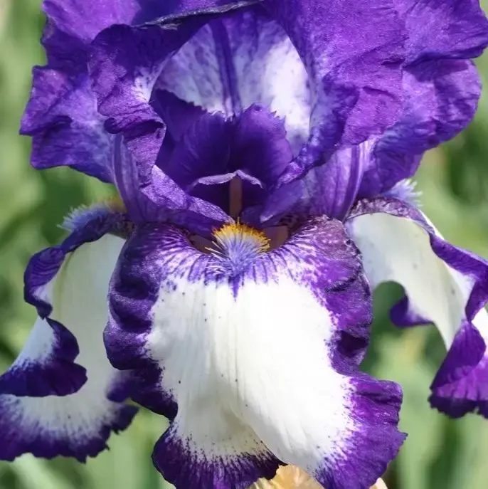 - Tall Bearded Iris with dramatic violet and white blooms