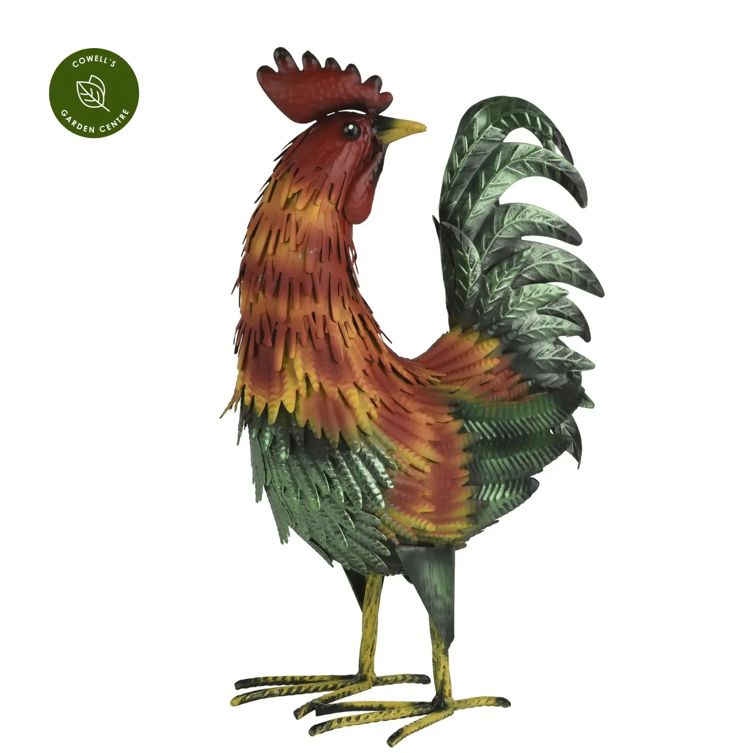 A bold and characterful iron cockerel with rich painted detailing, designed to bring rustic charm and colour to outdoor spaces.