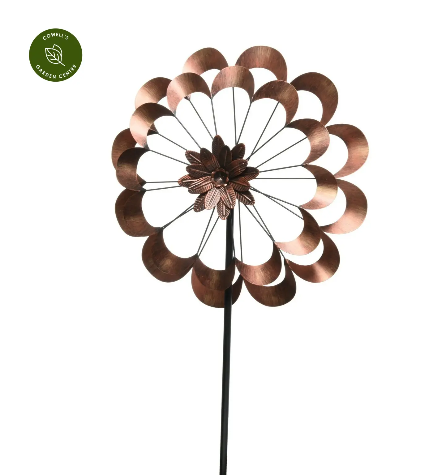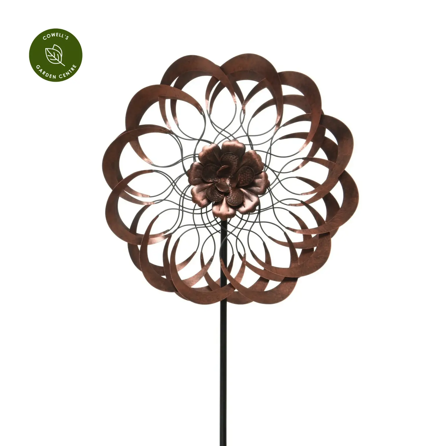 Striking iron flower windmill crafted from brown and copper-toned metal, designed to add movement, height, and sculptural interest to outdoor spaces.