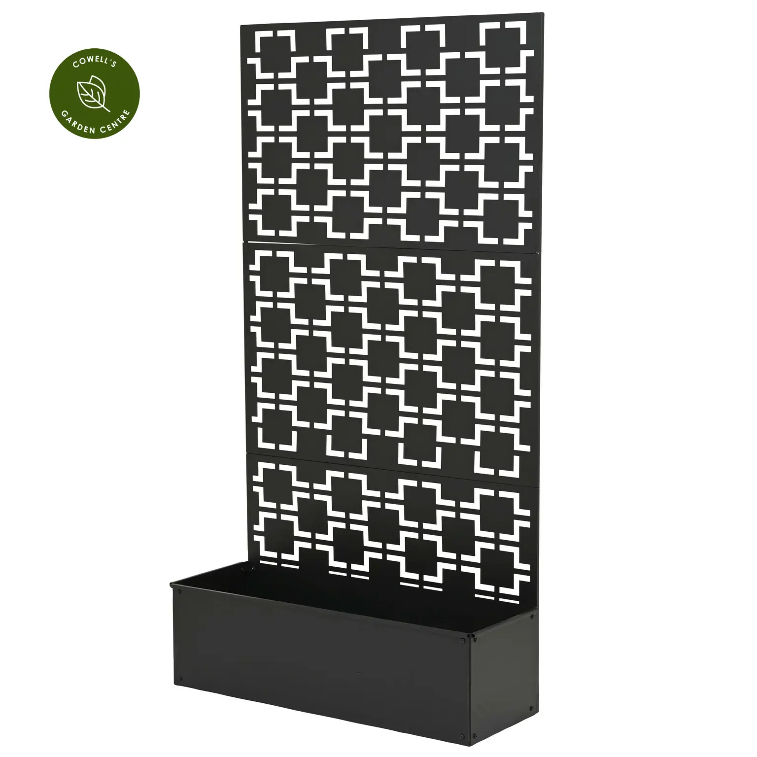 Create a bold, contemporary feature in your garden with this striking metal screen and integrated planter. Finished in black, the geometric cut-out pattern delivers strong visual impact while still allowing light to filter through.