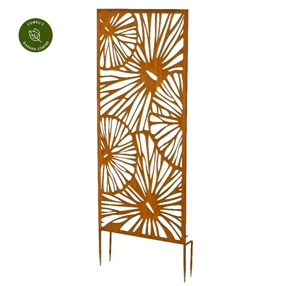 - Decorative metal garden screen with bold cut-out design