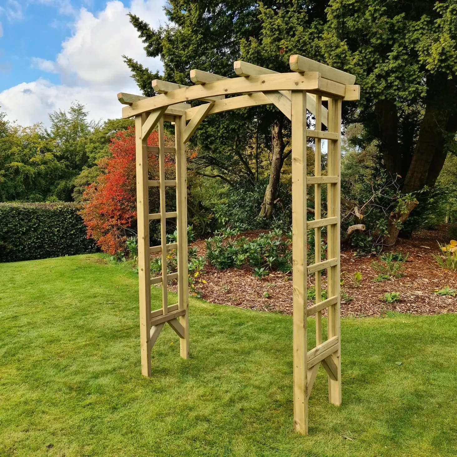 A sturdy and substantial garden arch featuring an elegant pergola-style top and trellis sides, perfect for supporting climbing plants and creating a striking garden focal point.