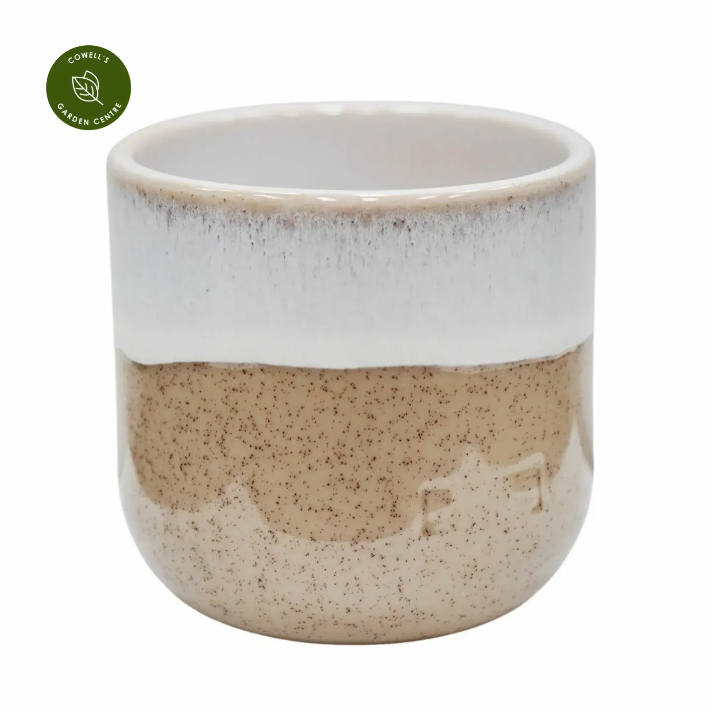 A simple, stylish ceramic planter finished in a soft sand tone with a dipped reactive glaze. The natural speckled base and subtle glaze contrast give it a warm, handcrafted feel, perfect for complementing houseplants in any setting.