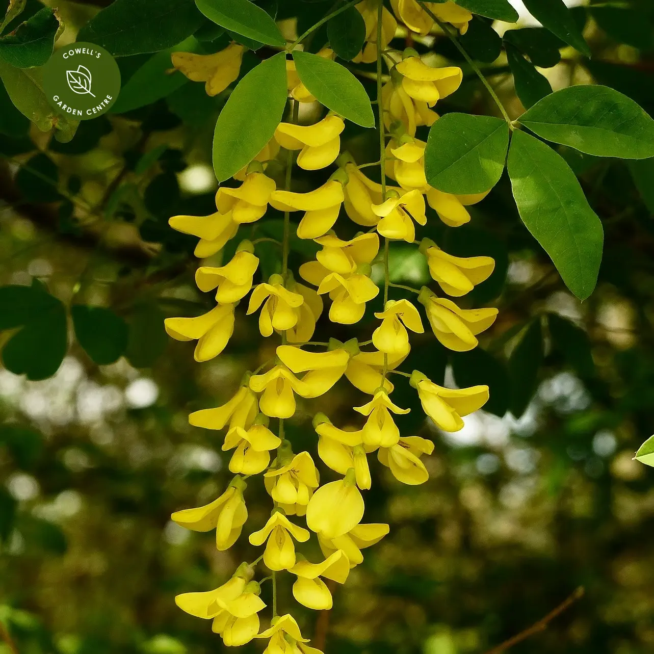 Laburnum 'Sunspire' is a narrow, upright small tree grown for its spectacular display of cascading golden flowers in late spring. Long racemes of bright yellow, pea-like blooms hang gracefully from the branches, creating a dramatic and elegant feature in the garden.