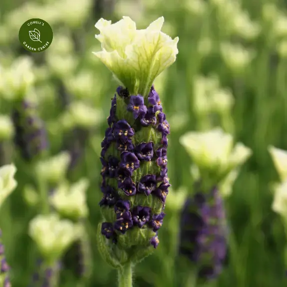Lavandula 'Tiara' is a striking French lavender with distinctive two-tone flowers - deep purple heads topped with elegant white ‘tiara’ bracts. These unusual blooms rise above aromatic, evergreen foliage, creating a bold and eye-catching display throughout summer.