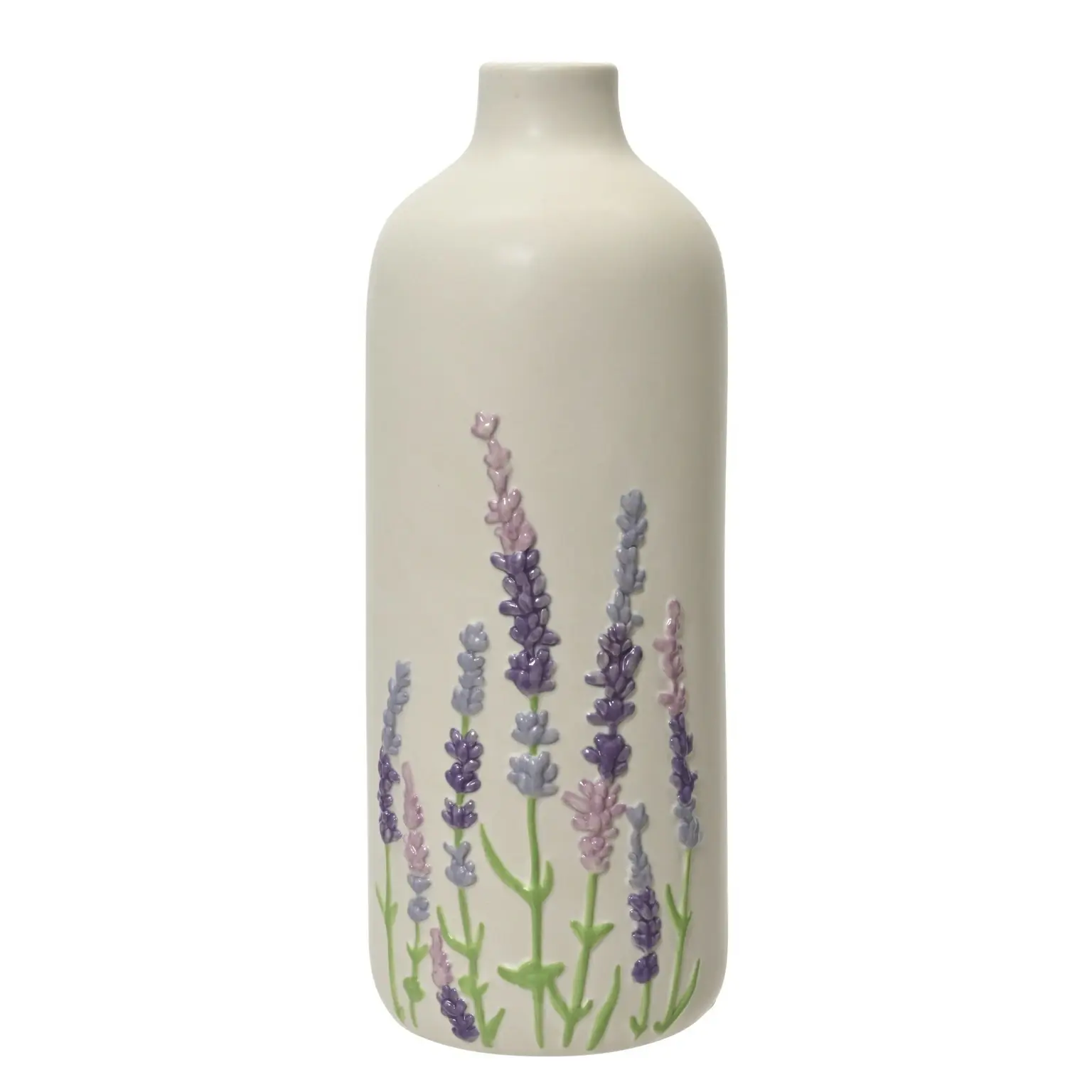 An elegant, handmade porcelain vase with an off-white matt finish, decorated with a soft lavender design that adds a gentle, calming accent to indoor spaces.