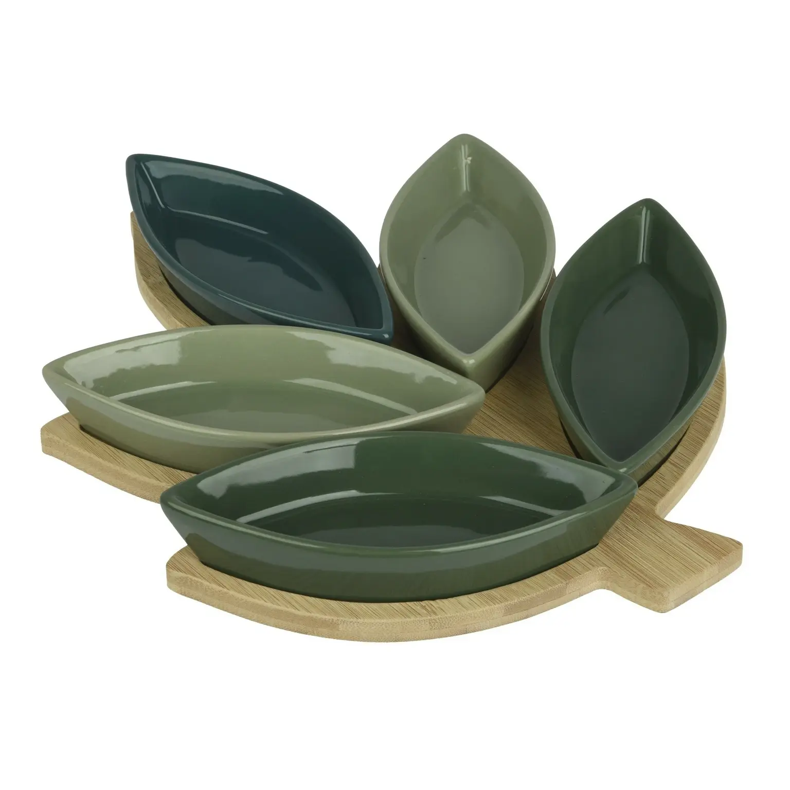 A beautifully coordinated food safe serving set featuring a natural bamboo board and 5 leaf-shaped green porcelain dishes, perfect for stylish indoor entertaining. Perfect for for dips, snacks, nibbles and sharing platters.