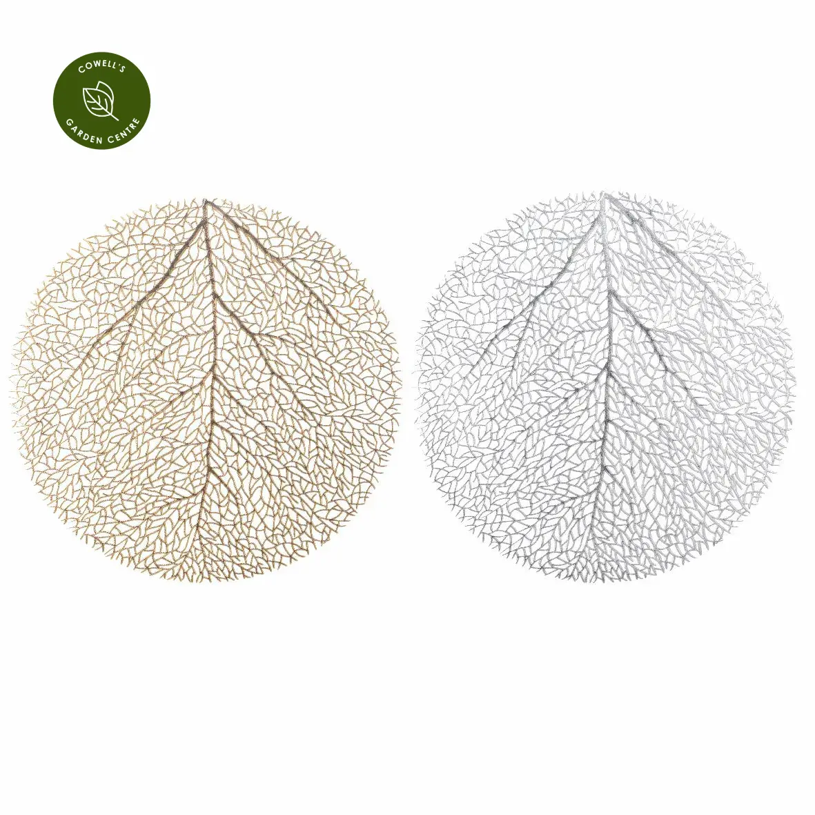 Shimmering cut out placemat in a leaf skeleton shape.