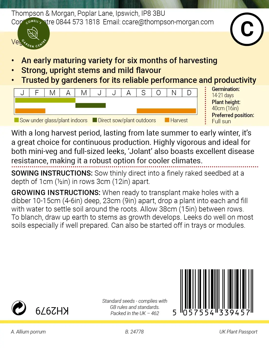 Leek ‘Jolant’ offers 6 months of harvest stretching from late summer into early winter. This early maturing variety produces sturdy, upright stems with a mild flavour. Exceptionally vigorous, it suits both mini and full-size cultivation. Its strong disease resistance ensures dependable growth even in cold, northerly gardens.