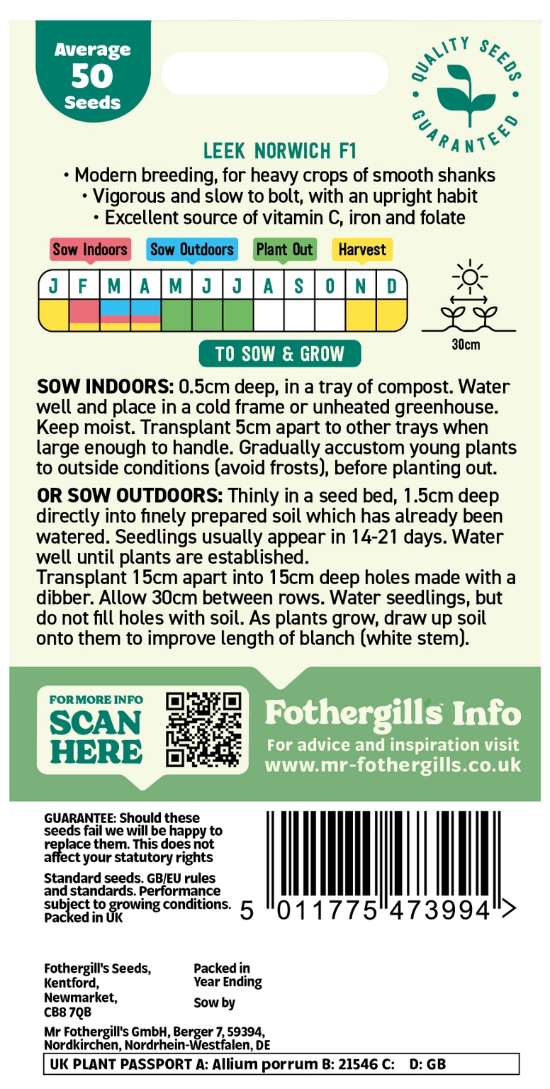 Quality, British maincrop variety. Apply high nitrogen fertiliser to your leek bed just prior to planting them out in summer to help them through a long growing season.