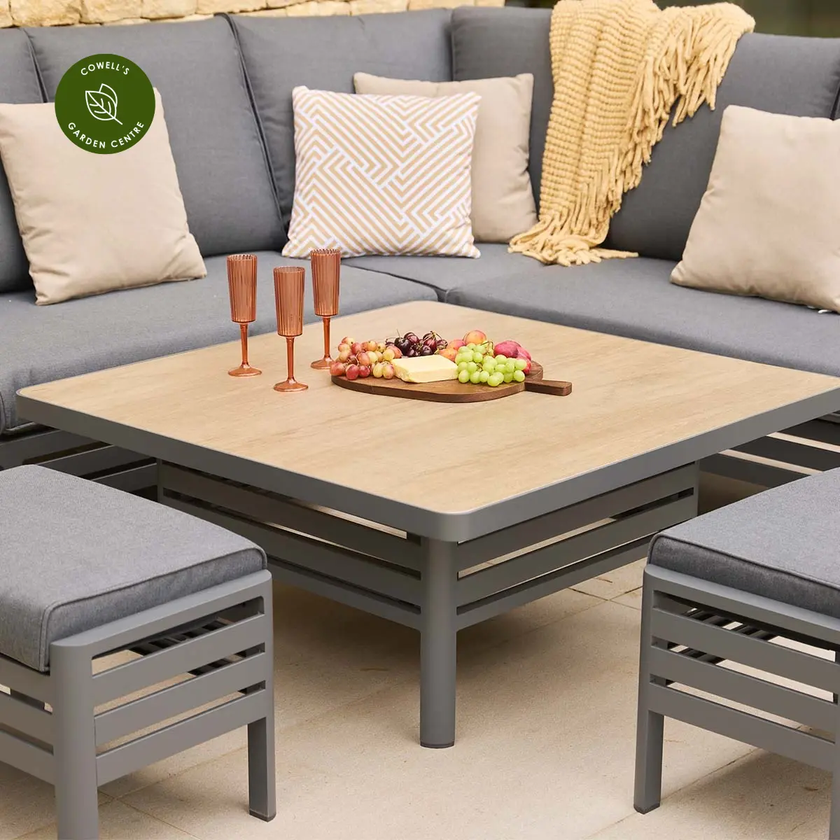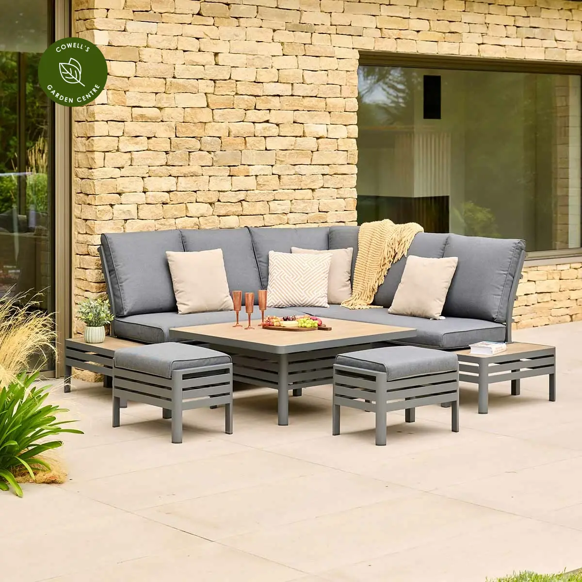 - Set includes one corner sofa, two stools, and adjustable table