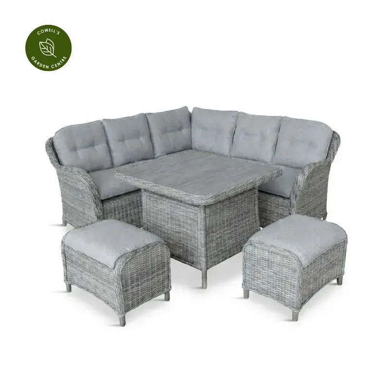 - Set includes a corner sofa for 5 people, two stool seats and one dining table
