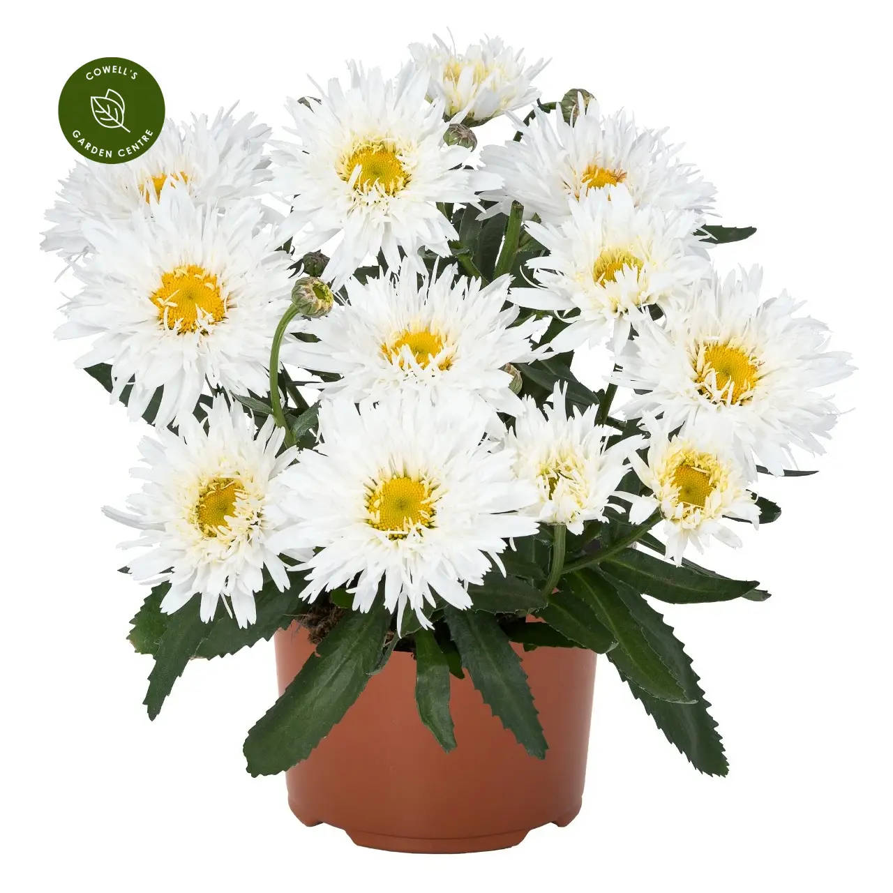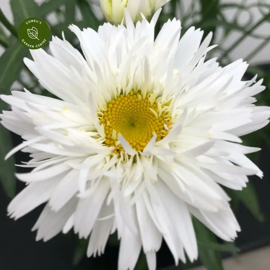 Leucanthemum 'Rebecca' is a striking, compact perennial producing beautifully fringed, semi-double white flowers with bright golden-yellow centres. Its textured, almost feathery petals give a softer, more decorative twist to the classic daisy form.