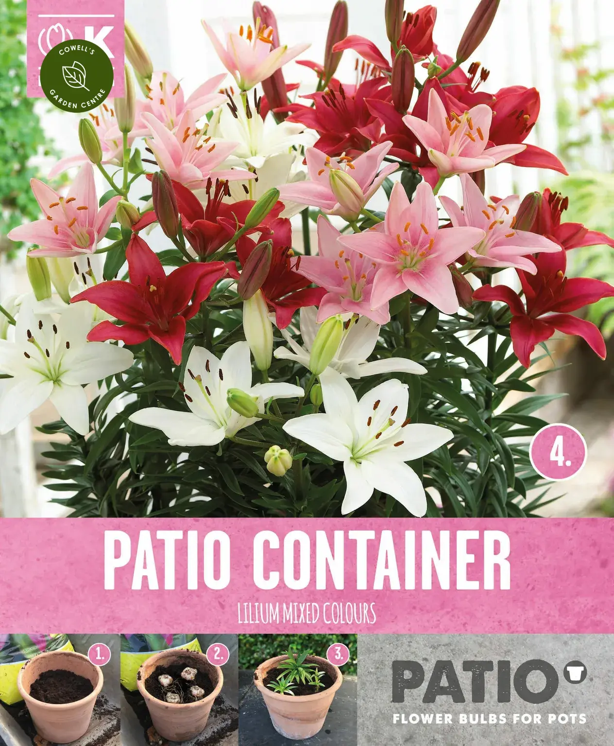 Lilium Sorbet Shades is a warm mix of red, pink and white flowers, ideal for patio containers.