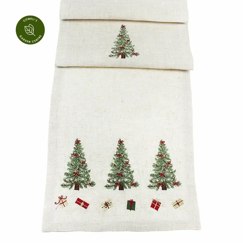 Bring some traditional charm to your festive decor with the Little Tree collection, featuring an embroidered design of Christmas trees on a natural white background. This rustic table runner is perfect for creating a classic seasonal atmosphere at the dining table.