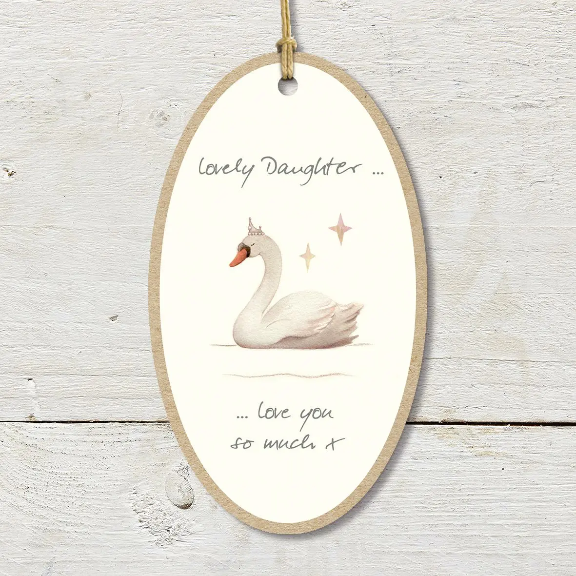 Large Wooden Plaque featuring a cute swan wearing a tiara with a ’Lovely Daughter… love you so much X’ caption. Perfect as a gift.