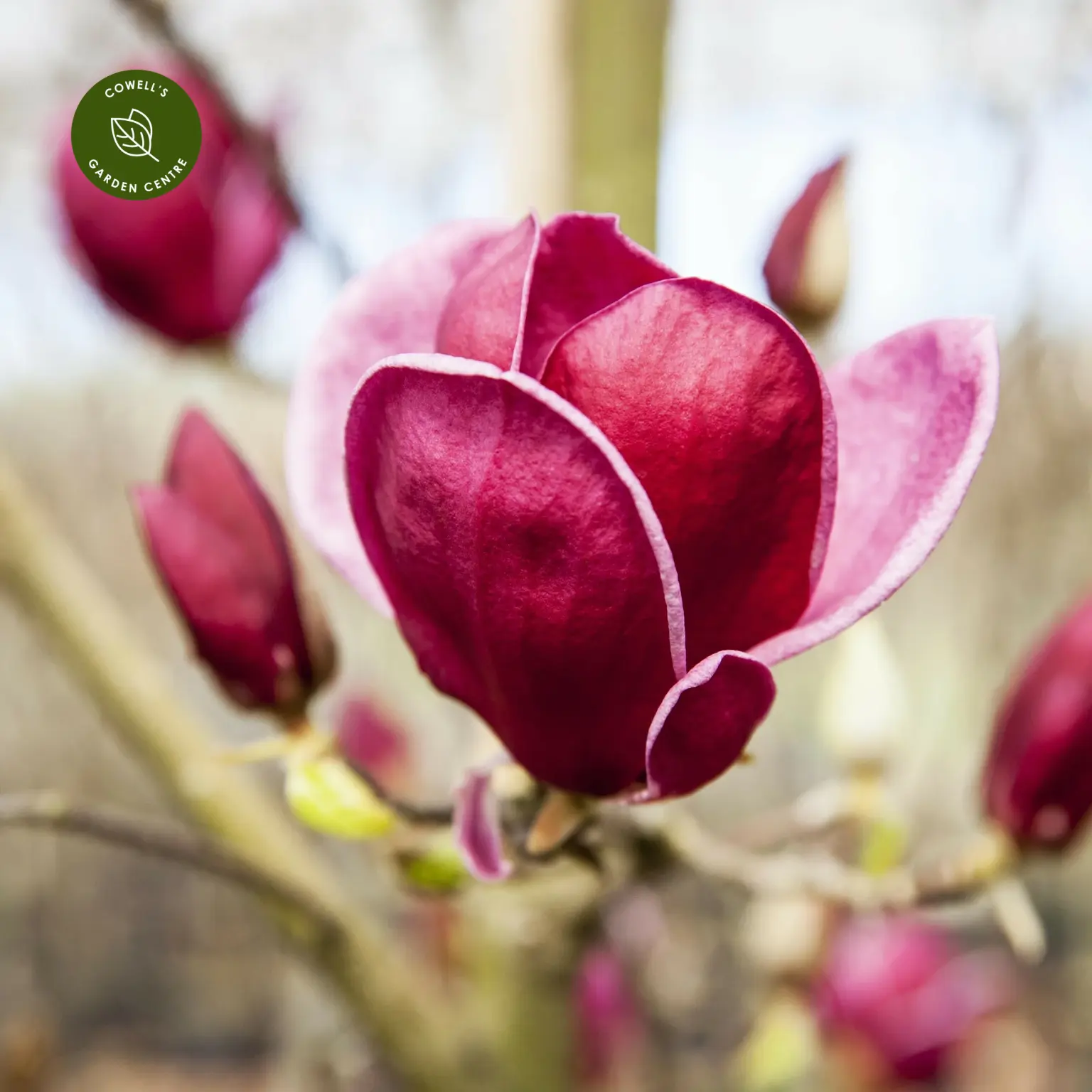 Magnolia 'Genie' is a striking, compact magnolia celebrated for its richly coloured, tulip-shaped flowers and wonderful fragrance. The blooms emerge in spring as deep blackish-red buds, opening to luxurious maroon flowers that stand out dramatically against the fresh green foliage.